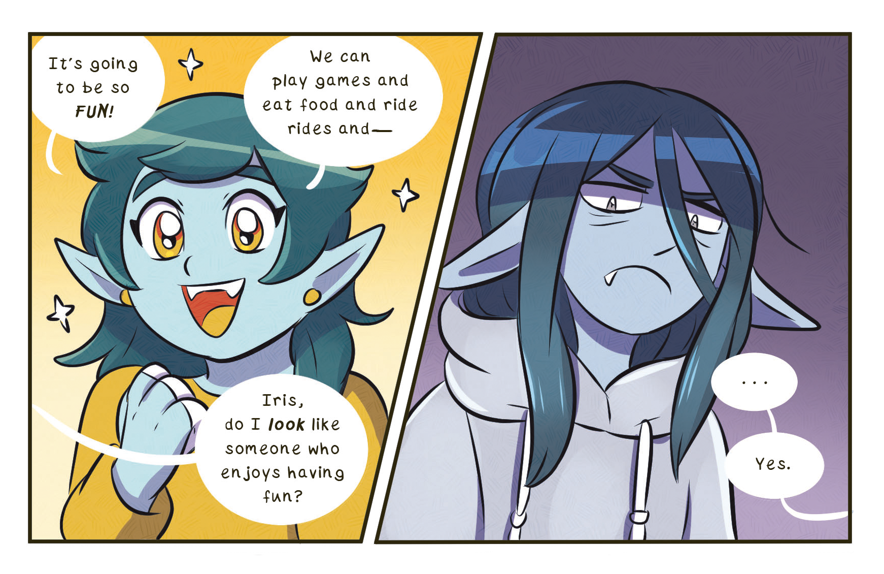 A: I wanted Larkspur to be mysterious, and also match the dark form Iris saw in her dream, so I decided to make him look like a little shadow guy. Technically I don’t think Larkspur or Iris were actually shadowy blobs when they were younger, so I guess it’s an artistic choice!